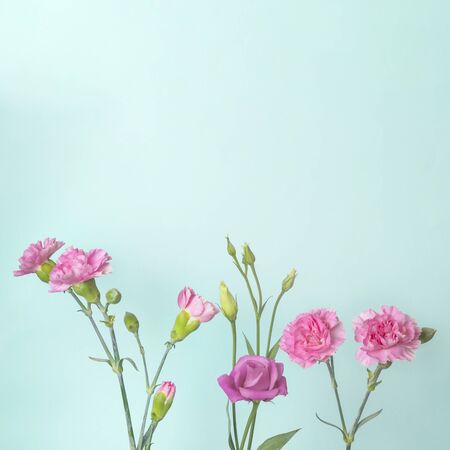 ピンクのカーネーションの花と青緑背景の芽 の写真素材 画像素材 Image
